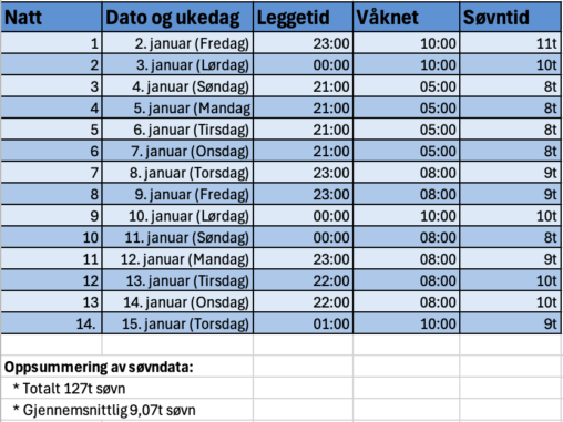 Dette er min søvndata fra 2.januar til 15.januar 2026. Dette er totalt 14 dager med registrert data som også gir en total søvntid på 127t og gjennomsnittlig søvn…