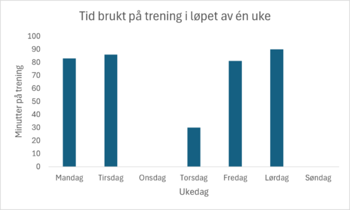 Dataene viser antall minutter jeg trente hver dag i løpet av én uke. Tallene er hentet fra treningsappen jeg bruker for å logge øktene mine, og er visualisert…