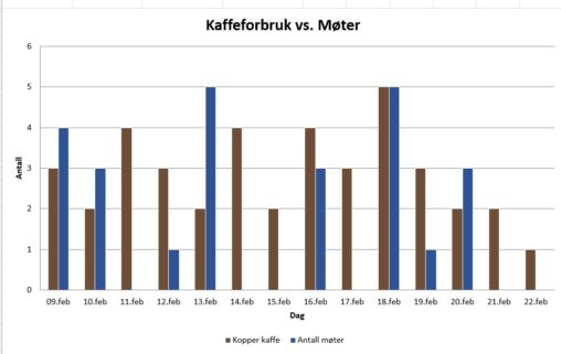 Antall kaffekopper pr. dag og antall møter pr. dag for å se om det drikkes mest kaffe på dager med mange møter, eventuelt motsatt. Antall kopper kaffe er…