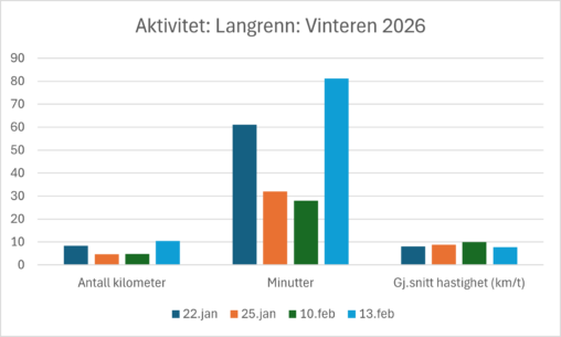 Graf som viser lengde, tidsbruk og gjennomsnittsfart på langrennsturer jeg har hatt hittil i år. Dataene er samlet inn via Garmin-klokke og visualisert i Excel.