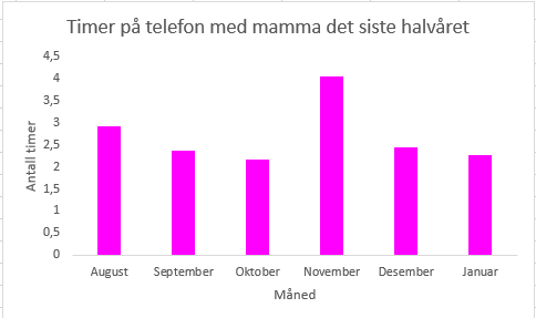 Bildet visualierer hvor mange timer jeg har brukt på telefonen med min mamma det siste halve året, fra august 2025 frem til og med januar 2026.Basert på data…