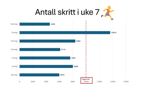 Dette diagrammet viser antall skritt jeg har beveget meg, og antall øvelser hos fysioterapeut i løpet av 15 dager. Artig å se at antall skritt øker i helgene.