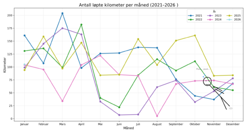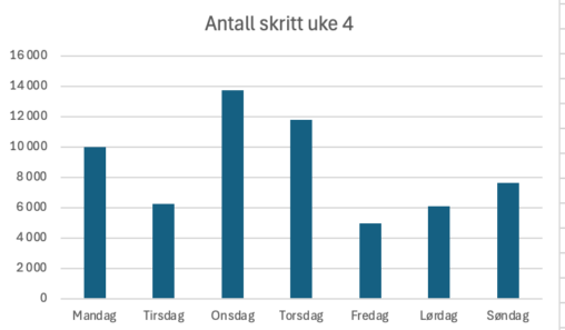 Stolpediagrammet viser en oversikt over antall skritt jeg har gått månedlig de siste 12 månedene. Data er hentet fra min pulsklokke Garmin Vivoactive 5. Jeg overførte data fra…