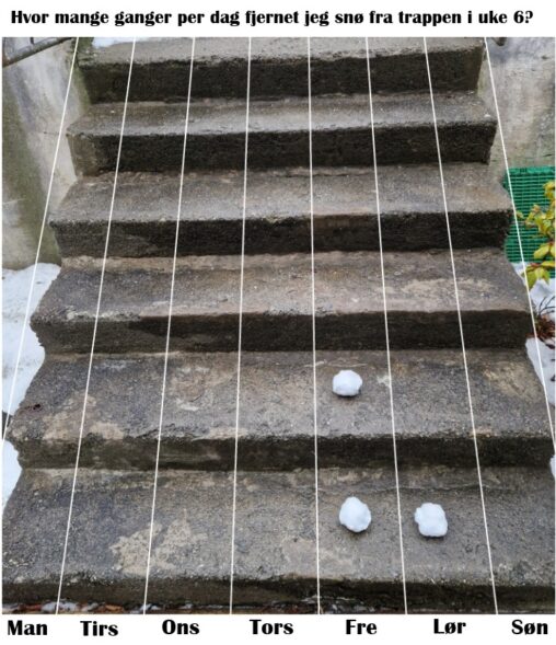 I en uke, skrev ned gjennomsnitts utetemperatur (morgen/kveld) og telte hvor mange ganger kattene sto ved døren og skulle ut, og gikk ut. Noterte samtidig hvor mye vi…