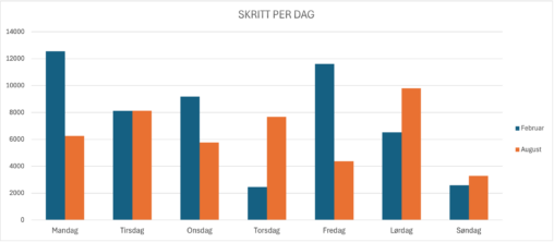 Table illustrating number of steps taken per day, the blue columns representing a week in February and the orange columns representing a week in August. I am the…