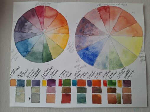 Two colourwheels, showing mixed primary, secondary and tertiary colours, using watercolour paints of different hues, brand and types. Swatches of two already mixed watercolours, so four colours altogether,…