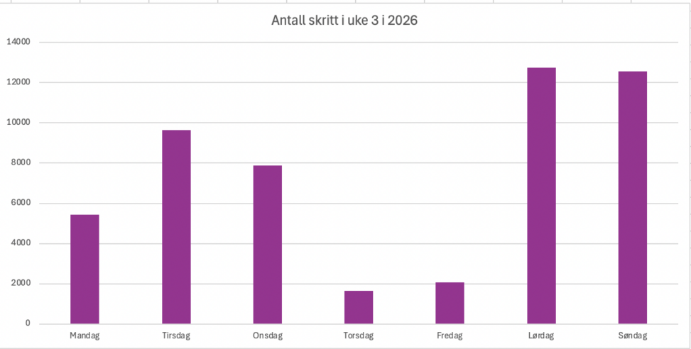 Diagrammet er laget i Excel der det viser hvor mange skritt jeg tok de forskjellige dagene i uke 3 i 2026. Hver av søylene representerer antall skritt jeg tok.