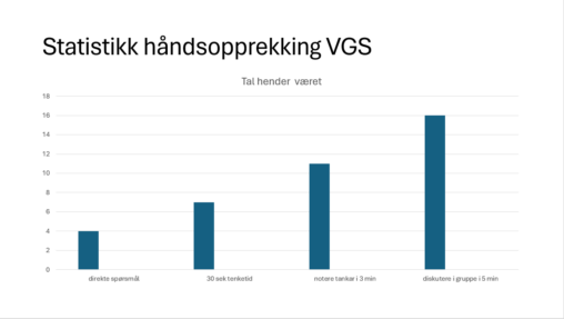 Respons frå elevane mine med ulike metodar. 30 elevar i klassen. Konklusjon: Direkte spørsmål, altså den klassiske metoden der lærar spør klassen “ut i lufta” og peiker på…