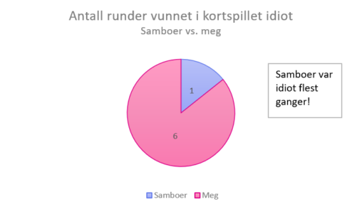 Sektordiagrammet viser data innsamlet fra kortspilling mellom samboer og meg. Dataen består av antall ganger hver av oss har vunnet i løpet av syv runder.