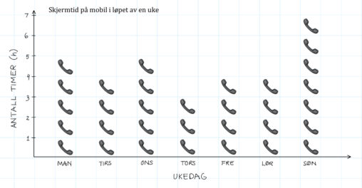 Representerer antall timer brukt på mobil per dag på en uke. På y-aksen vises antall timer, målt i timer, mens på x-aksen representeres ukedag som søyler.