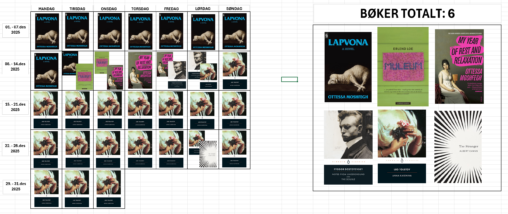 Bøkene jeg selv har lest i desember visualisert i kalenderen. Dagene hvor en bok ble fullført og en ny startet viser to bøker på samme dag. Bilder tatt…