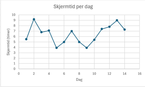 Visualiseringen viser daglig skjermtid over en periode på to uker. Hver prikk representerer total skjermtid for en dag målt i timer, mens linjen mellom punktene gjør det lettere…