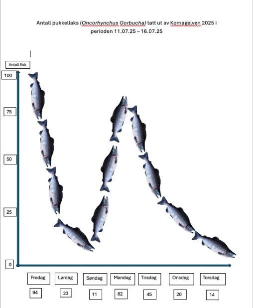Viser en graf laget av pukkellakser som svømmer, som representerer fangsttall for en gitt periode i Komagelven. Y-aksen er antall pukkellaks, og X-aksen er dagen de ble fanget….