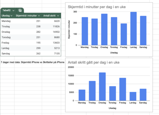 En sammenlikning av noen av de dataene som jeg sjekker oftest på telefonen, nemlig skjermtid og antall skritt gått. Disse dataene vekker sterke følelser, og er definerende for…