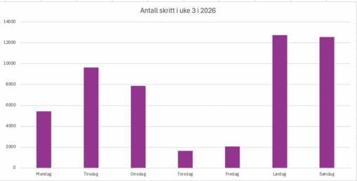 Dette er et diagram som visualiserer antall skritt i uke 3 (2026), der hver søyle representerer antall skritt for hver dag i uke 3. Dataen er hentet fra…
