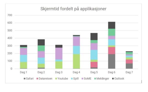 Viser hvor mange intensitetsminutter eg hadde kvar dag i veke 39. Data er samla inn ved hjelp av pulsklokke, og tala er henta frå appen til Garmin. Visualiseringa…
