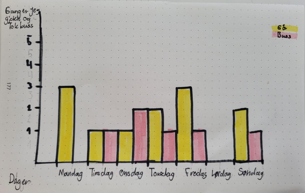 Visualiserer hvor mange ganger jeg gjekk og eller tok buss til og fra hjemme.