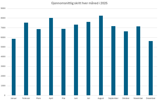 x-aksen viser månedene i 2025 mens y-aksen viser antall skritt. Antall skritt per måned er ikke helt nøyaktig ettersom det er tatt utgangspunkt fra helse appen som kan være litt upålitelig samt at telefonen ikke er med meg gjennom hele dagen til å registrere.