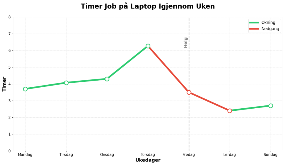 Grafen er en visualisering skjermtiden jeg har hatt på laptopen min den siste uken. Den gir et godt bilde av hvor mye jeg har arbeidet med studier, siden jeg hovedsakelig bruker laptopen til skolearbeid. Dataene viser tydelig hvordan jeg jobber mest i ukedagene og mindre til helgen.