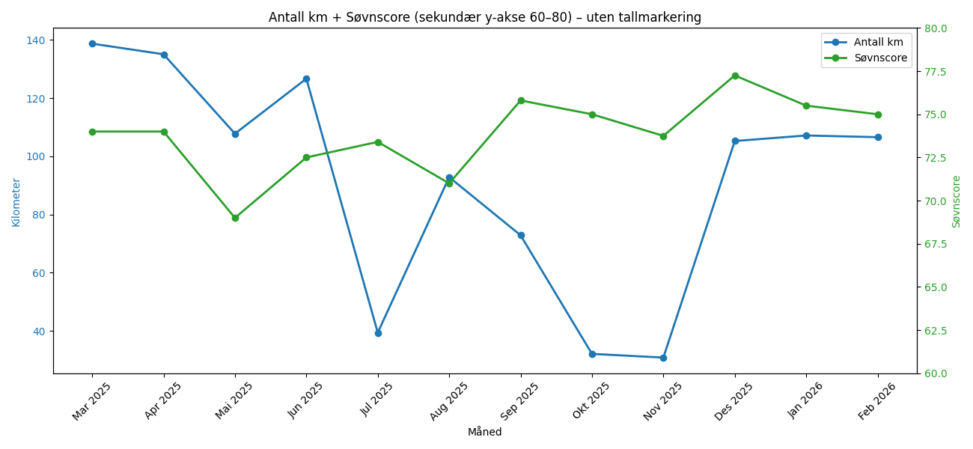 Visualiseringen viser månedlige data for løpte kilometer (km) og søvnscore for perioden mars 2025 til februar 2026. Kilometer er plottet på primær y‑akse, mens søvnscore vises på sekundær y‑akse (skala 60–80).