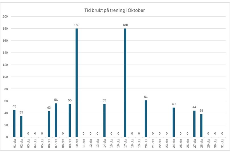 Visualisering av tid brukt på trening i Oktober 2025. Tid er i minutter. Data er kopiert fra appen Hevy, som blir brukt til å logge treningsøkter. Figuren er lagd i Excel.