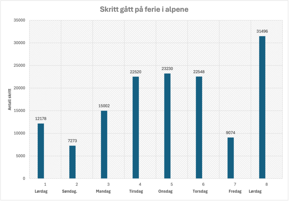 Antall steg gått på ferie i alpene visualisert ved bruk av tall tatt fra Helse appen og diagram laget i Excel