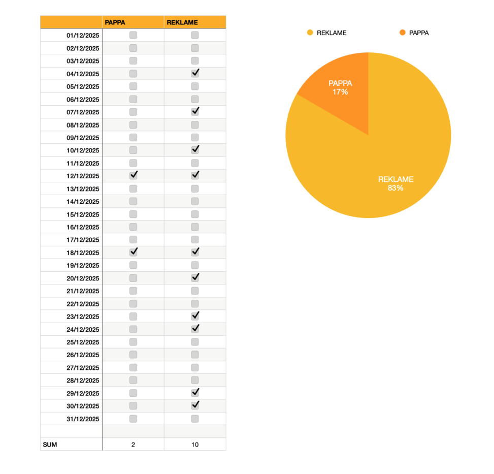 Dette er en tabell over alle dagene faren min har ringt meg i løpet av desember 2025, vs. antall ganger jeg har blitt ringt av ulike bedrifter for reklame i samme periode. Ved siden av tabellen er det en figur som viser summen i prosent.