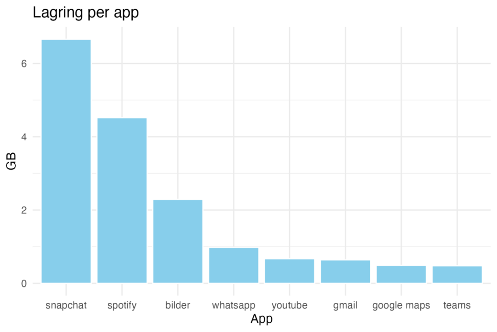 En graf som viser de 8 appene som bruker mest lagringsplass på mobilen