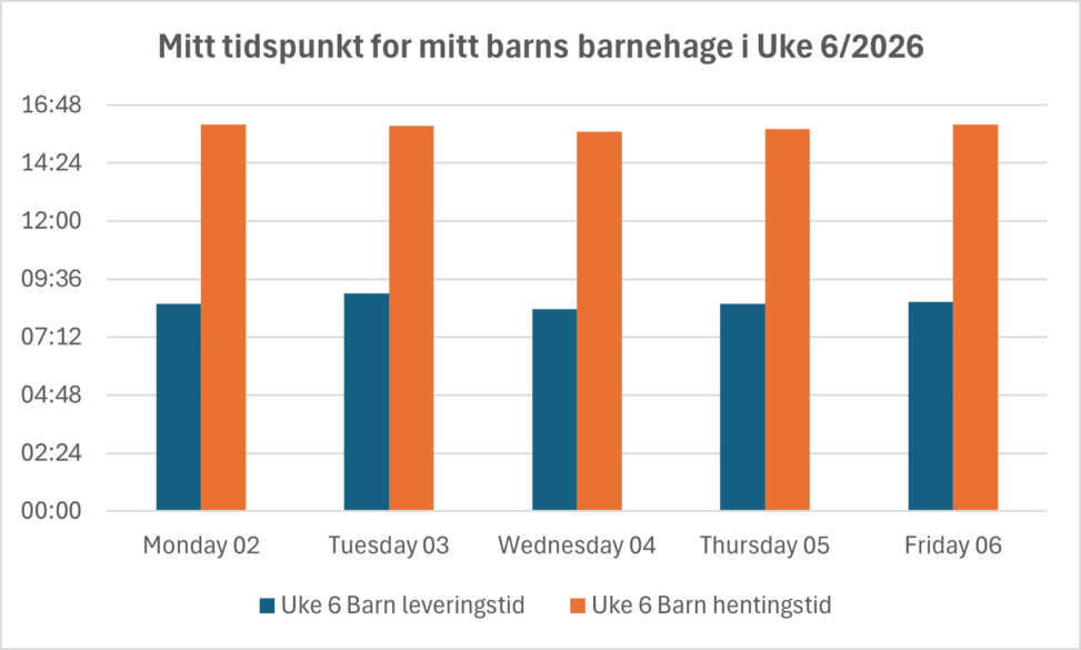 Visualiseringen viser min handlinger som forelder ansvar knyttet til barnet mitt i uke 6 av 2026. Bildet ble utviklet av excel inndre software etter jeg ga den min aktiviteter i uke 6 fra MyKid appen. Bildet viser uke dager fra mandag til fredag i x-aksen og levering og henting tider ligger i y-aksen. Jeg eier data i visualiseringen.