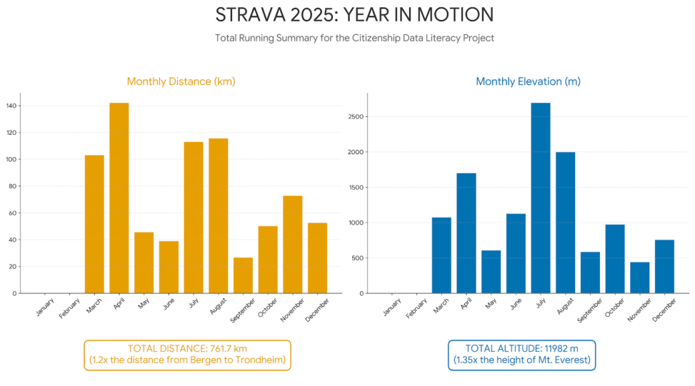A visual depiction of my running stats for 2025 focused on distance and elevation. Also includes a comparison of relative distance and height comparing my totals to Mt Everest and the distance from my hometown of Bergen to Trondheim