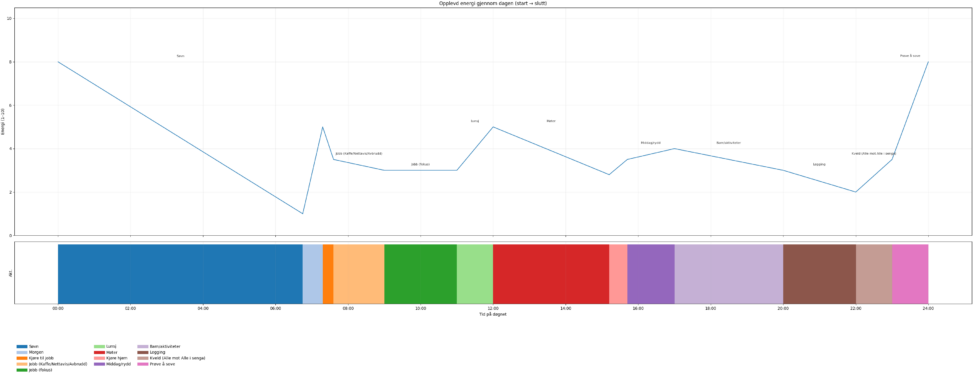 A visualisation of experienced/selfreported energy levels through an average day. Energy levels are self-reported estimates. All estimates reported at time of low energy. Read as fictional.