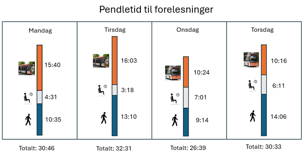 Dataene representerer tiden det tar for meg å pendle hjemmefra til forelesninger på universitetet. Data er målt i minutter og sekunder. Pendling inkluderer spasering, venting på kollektiv transport og reising med kollektiv transport (bybane eller buss). All data er selvprodusert.