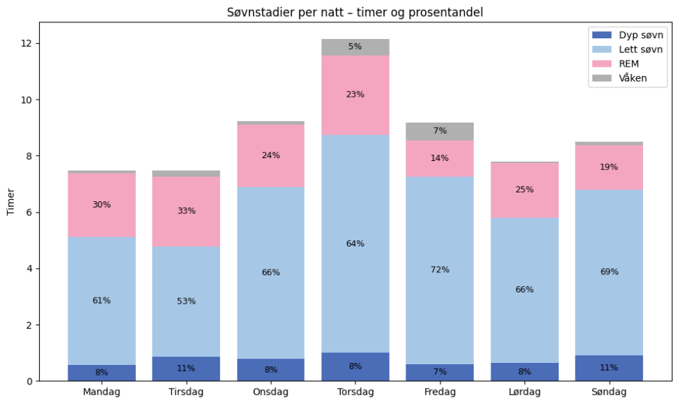 Et søylediagram som beskriver hvordan søvnen for hver natt i en uke er prosentvis fordelt i de ulike søvnstadiene (våken, lett søvn, dyp søvn og REM). Søvnen er målt i timer og data er hentet fra Garmin.