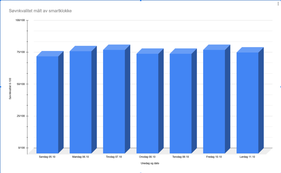 It is a representation of sleepquality measured by a smartwatch during a week (Sunday – Saturday). Data collected by a private person. Owned by user of watch, through license in fitbit.