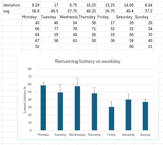 Data was gathered using home assistant. Used grafana to find lowest % each day, moved manually to excel to average it by weekday and find the standard deviation.