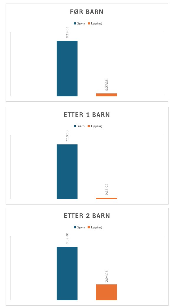 Ukentlig gjennomsnittstid for nattesøvn og løping, målt over en periode på 1 år for tre ulike faser i livet; før barn, etter 1 barn og etter 2 barn.