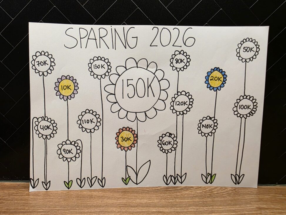 Visualiseringen viser sparemålet mitt for 2026. Hver blomst representerer 10 000 kroner, som fargelegges etter hvert som beløpet på sparekontoen øker. Dataene er hentet fra kontooversikten i egen nettbank.