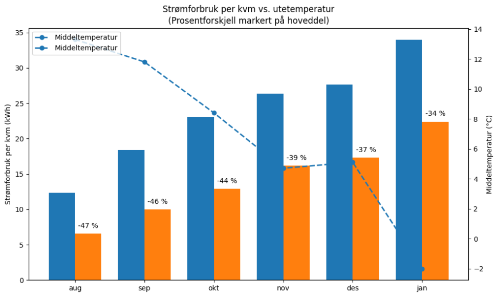 De blå søylene viser forbruk per kvm i leiligheten, mens de oransje søylene viser forbruk per kvm i hoveddelen. Den grønne, stiplede linjen viser middeltemperatur ute for de samme månedene.
