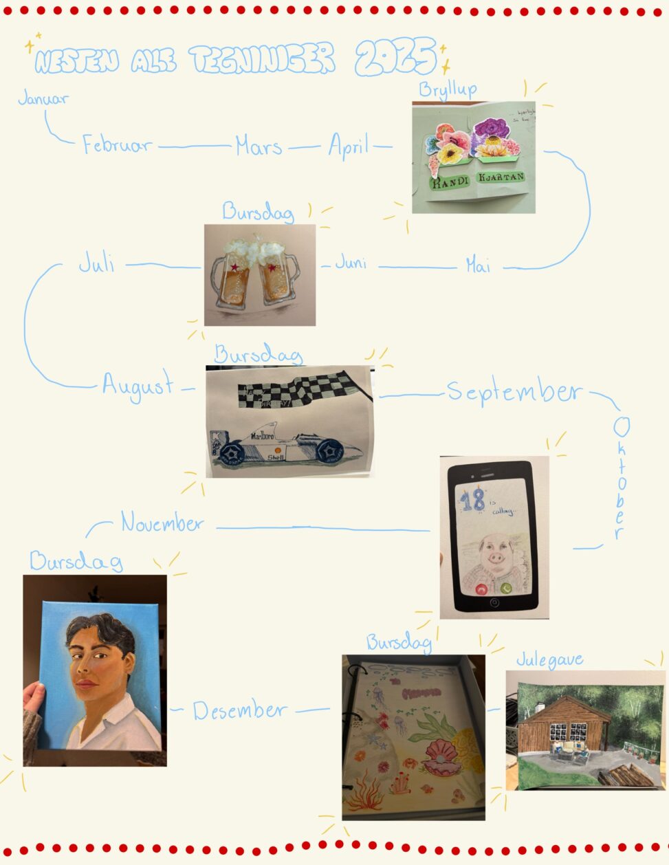 Summary of drawings drawn by me the year of 2025, shown with purpose of drawing and what month it was made.