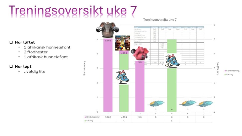 The visualization provides information about how much I have trained during week 7 2026. The total amount of weight lifted is illustrated by something that is recognizable – animals. The summarizing graph as well as the input data with activities are represented in the visualization.