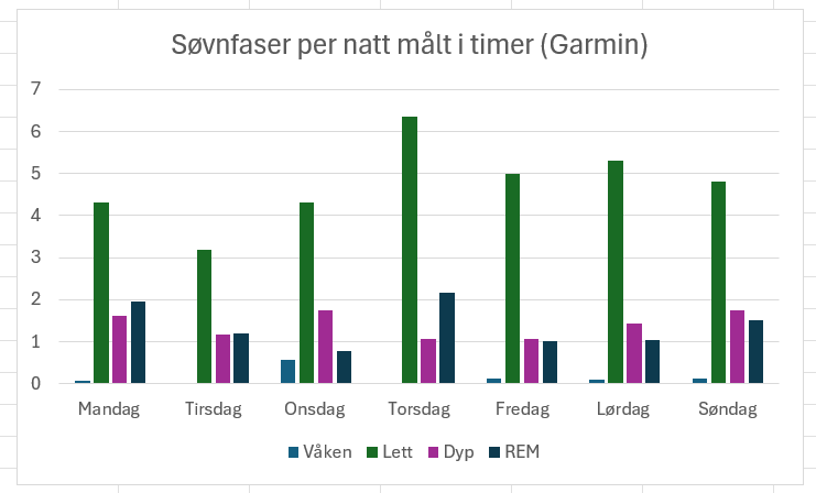 Analyse av søvnfaser, basert på data fra uke 2. Målt med min garmin forerunner 965.