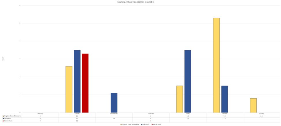 The grahs visualize the hours i have spent on different videogames throughout week 8. The unit of measurement is hours. Every coulured bar represent one of the games i have played this week.