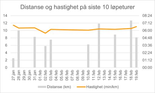 Visualiseringen viser min registrerte søvn i perioden 23. januar–19. februar. Hvert datapunkt representerer én natt og viser forholdet mellom søvnvarighet (timer og minutter omregnet til timer på x-aksen)…