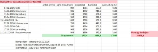 Dette er en budsjett som viser planlagte kostnader til turer til dansekonkurranser i 2026. Tabellen viser antall kilometer mellom Trondheim og dansehallen hvor er dansekonkurranse. I tillegg viser…